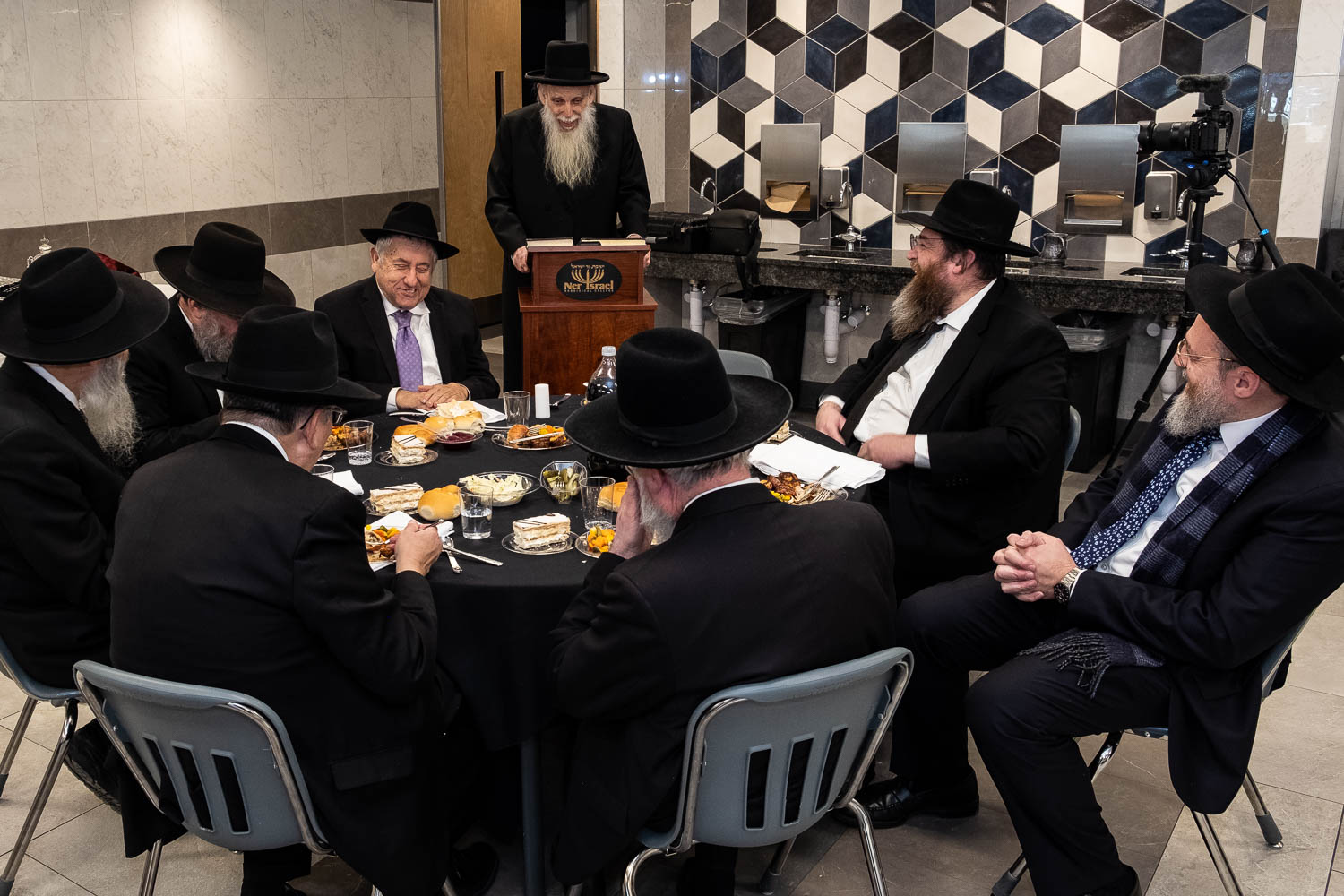 The festivities began with a gala lunch held in the Yeshiva’s new Ateres Lea Simcha Room.  Members of the Yeshiva Hanhala, including various Rabbeim, Rabbi Boruch Neuberger and the Rosh HaYeshiva Moreinu HaRav Aharon Feldman shlit”a, joined Mr. Menachem Klein, his sons Reuven and Yehuda Klein and friends and family to marvel at the beautiful new sefer.  Divrei bracha were given by the Rosh HaYeshiva shlit”a as well as by Mr. Klein.  Both remarked at the hashgacha of this event taking place in the newly renovated dining facility, which the Klein family had a major hand in.  After lunch the procession to bring the new sefer to the Yeshiva Beis Medrash began.