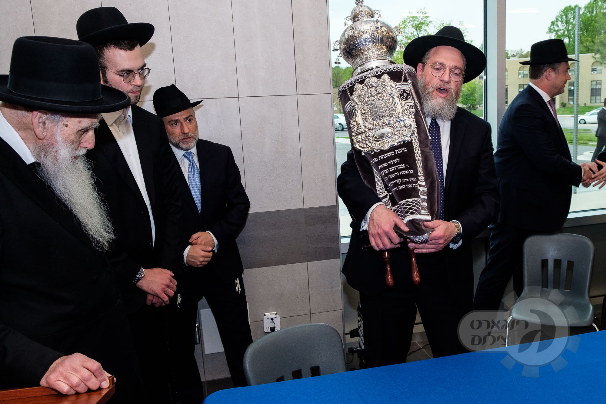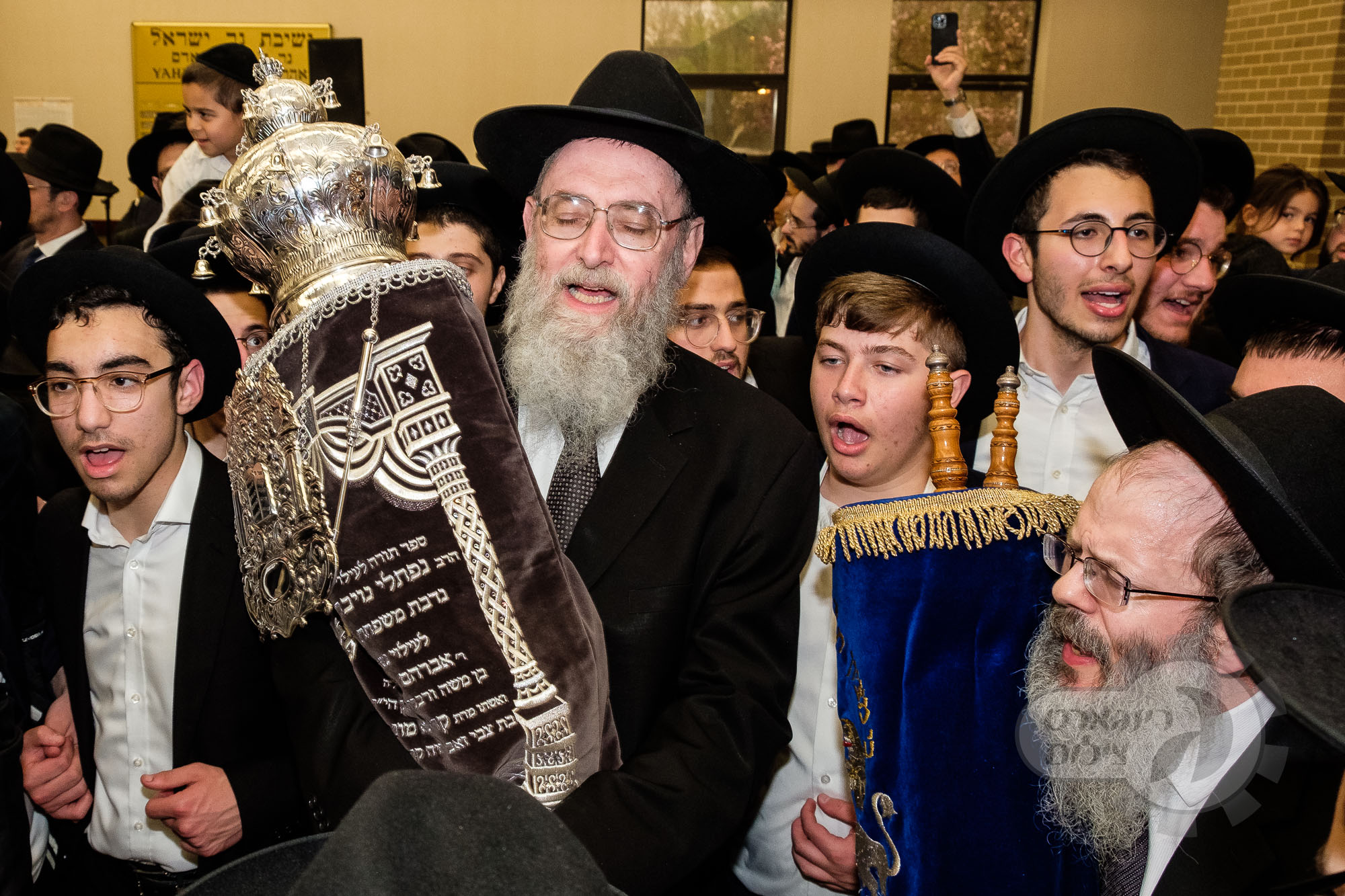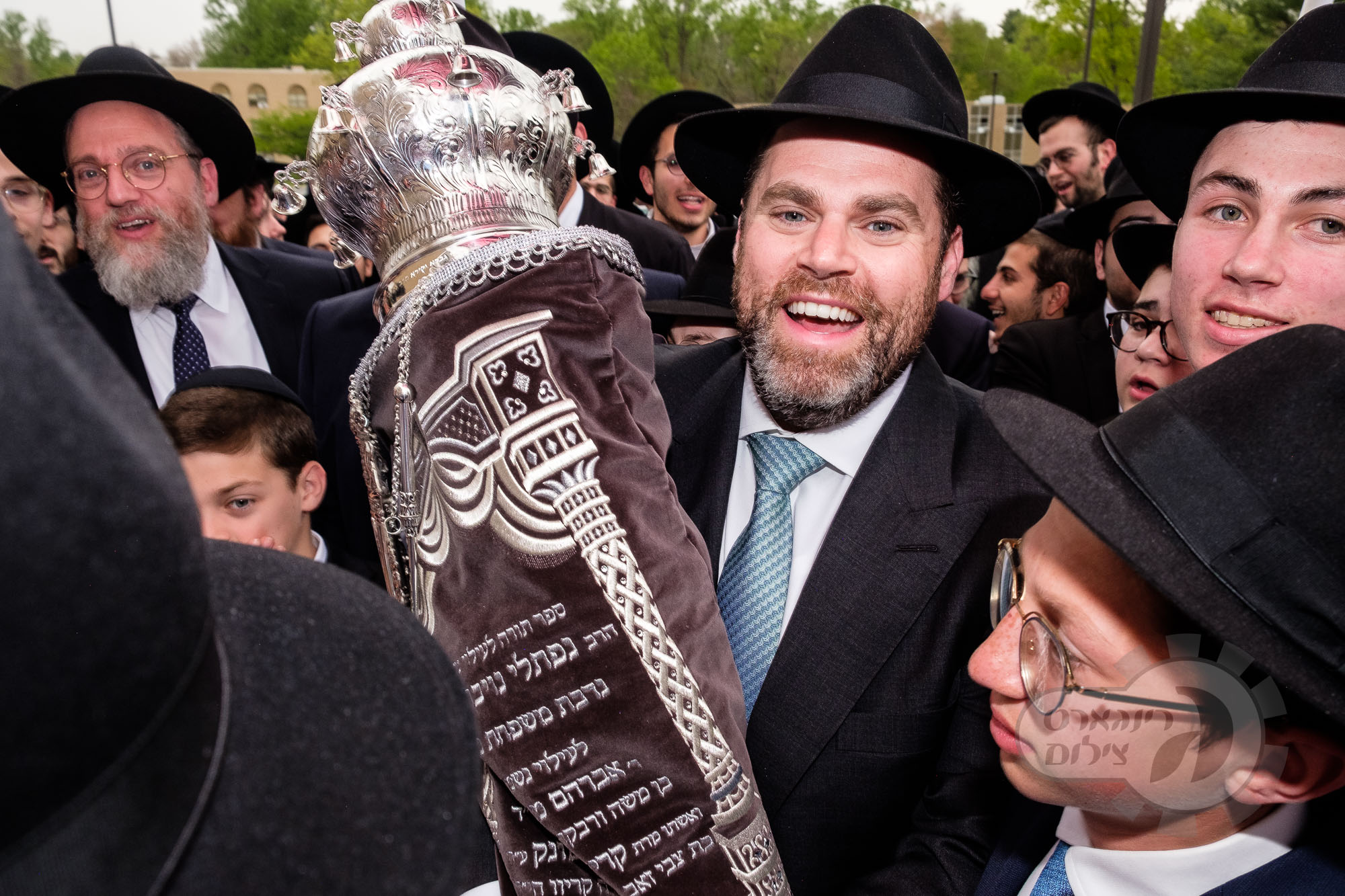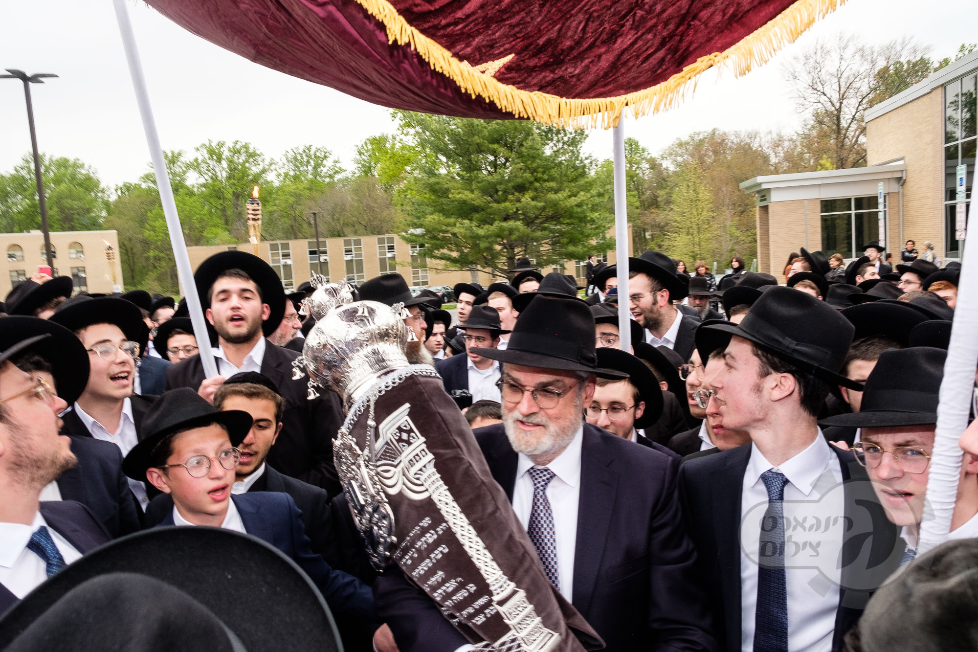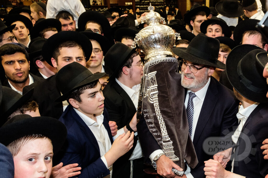 On Sunday, May 1st the Yeshiva held an Hachnosas Sefer Torah on campus. The new sefer was written by Rabbi Shlomo Naiman in memory and in honor of Rabbi Herman Naftoli Neuberger zt”l, the long time President of Ner Yisroel. The sefer was dedicated by the family of Dr. and Mrs. Zev Munk of Houston, TX in memory of Dr. Munk’s parents. Festivities began with the writing of the final letters of the Sefer Torah by the Yeshiva Rebbeim and Hanhala and members of the Munk family. Divrei bracha were given by the Rabbi Boruch Neuberger, Dr. Munk as well as by the Rosh HaYeshiva, Moreinu Harav Aharon Feldman shlit”a. Hundreds of yeshiva talmidim led the procession from the dining room to the Yeshiva Beis Medrash. Amidst live music and lively singing and dancing the Sefer was brought to its new home inside the Ner Yisroel Aron Kodesh. Families and children from those who live on the Yeshiva campus as well as from the greater Baltimore community came to watch and participate in this event of Kavod HaTorah.