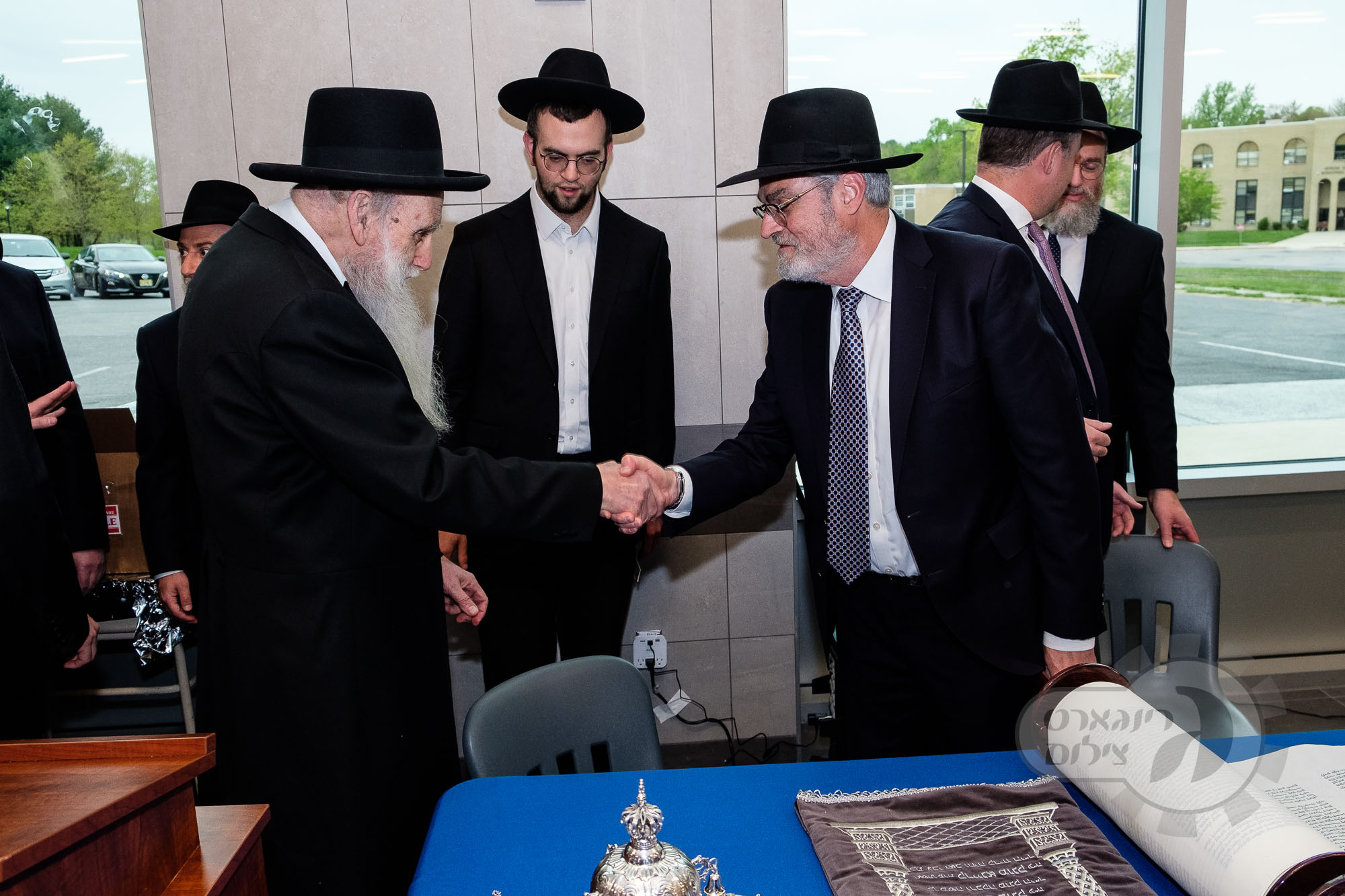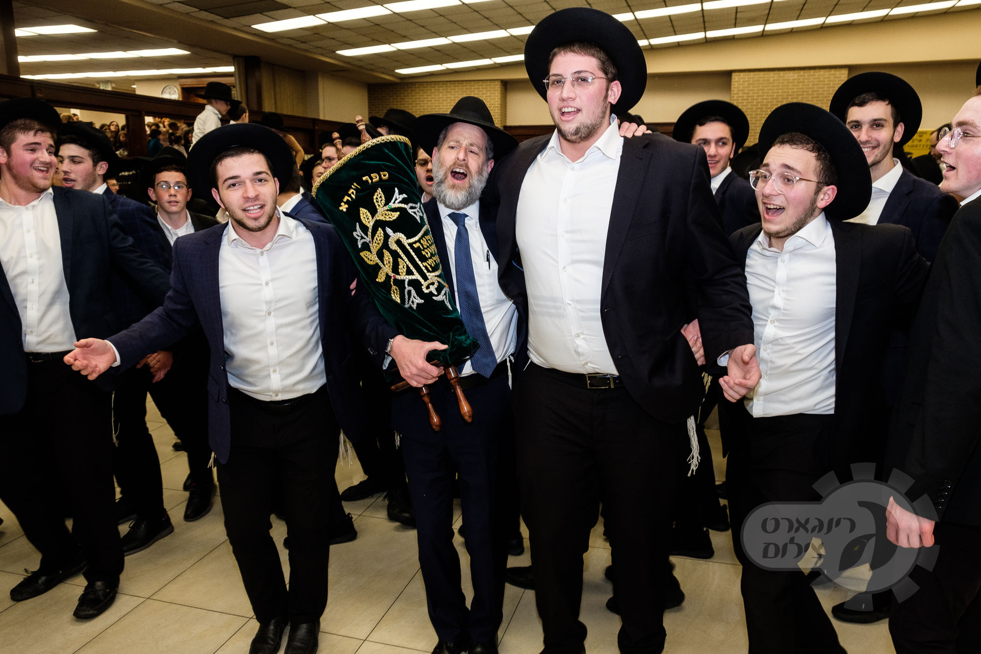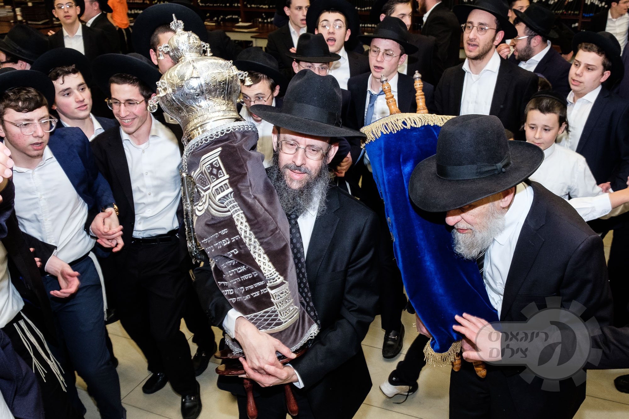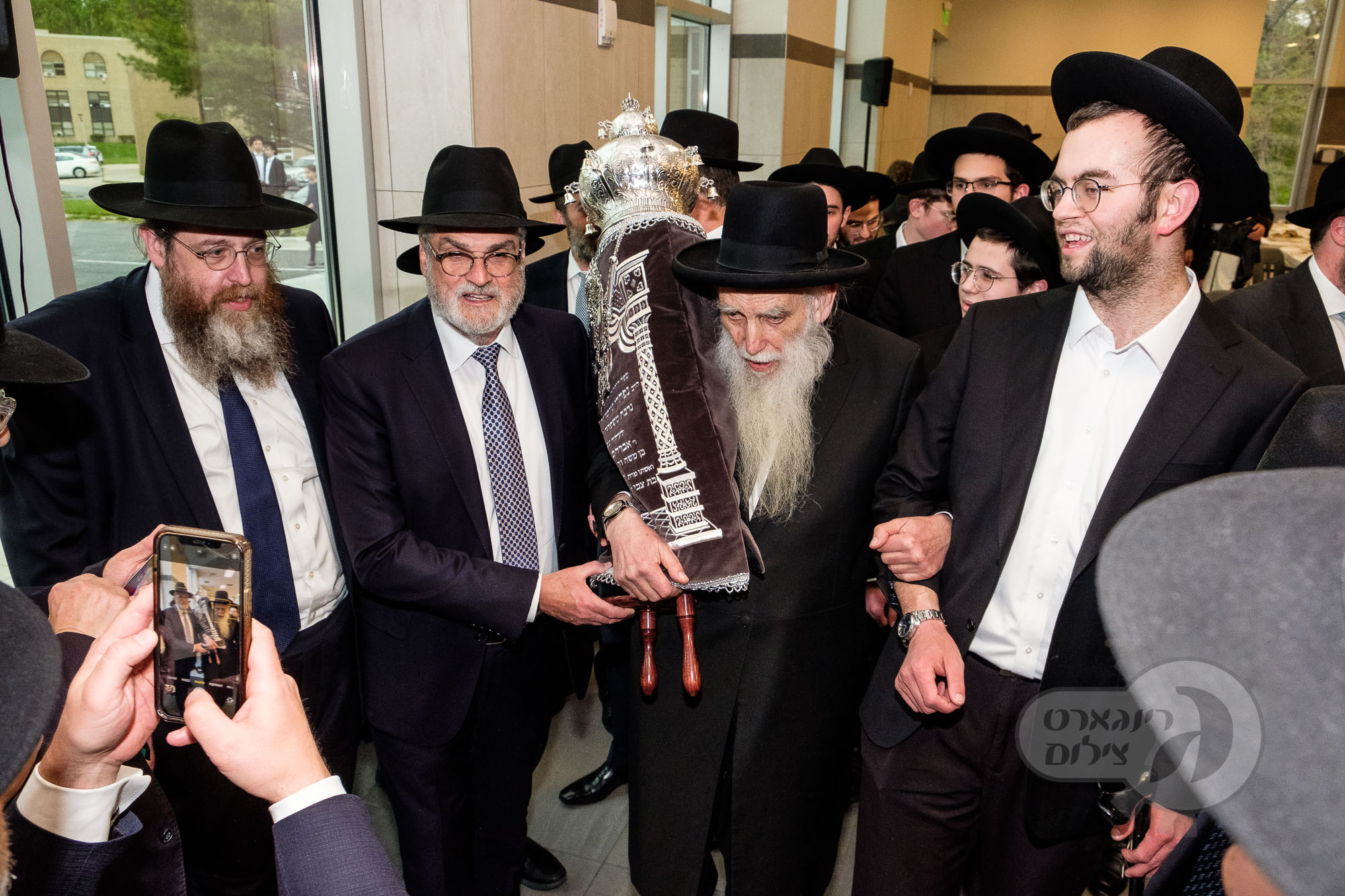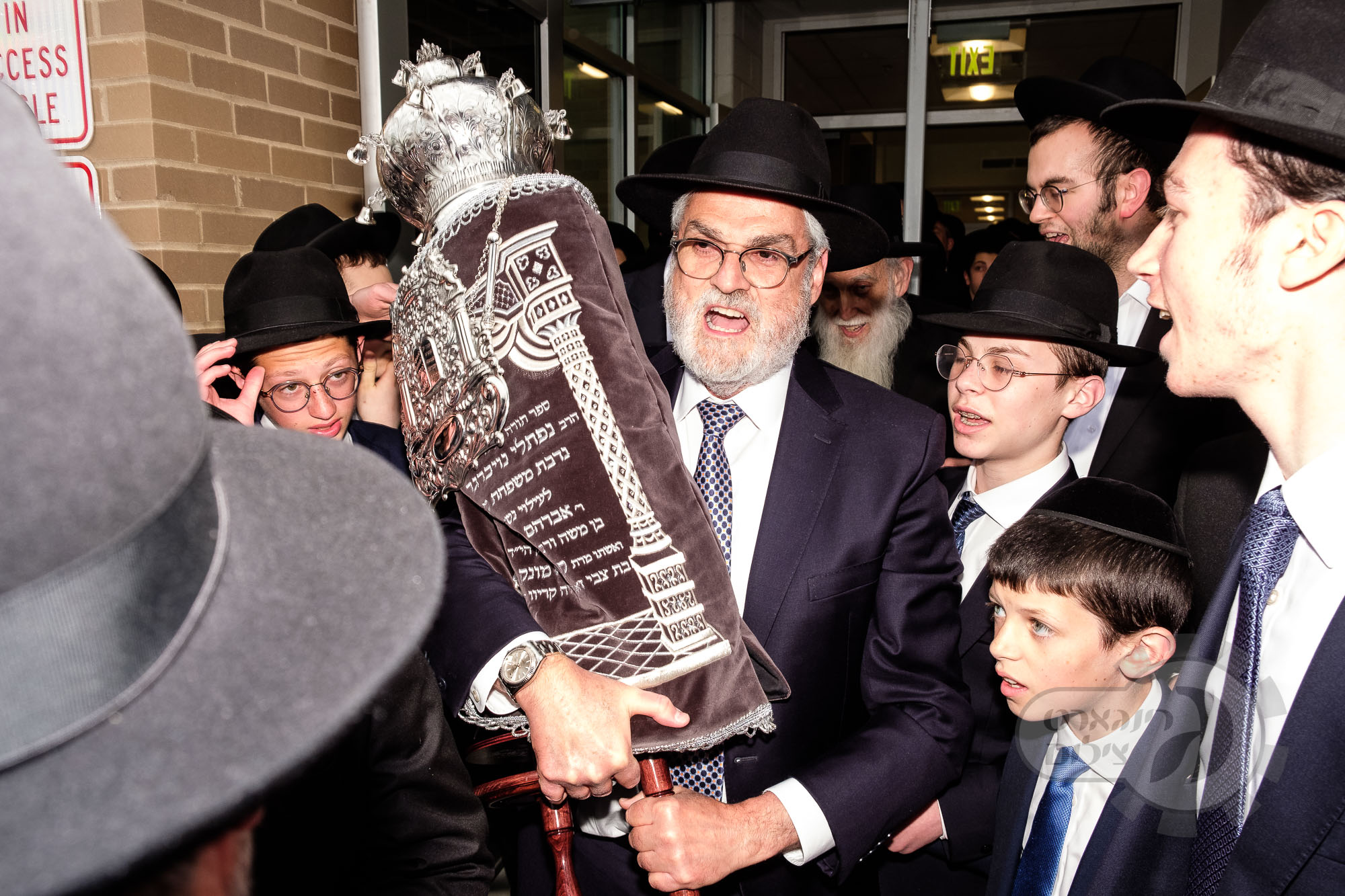 On Sunday, May 1st the Yeshiva held an Hachnosas Sefer Torah on campus. The new sefer was written by Rabbi Shlomo Naiman in memory and in honor of Rabbi Herman Naftoli Neuberger zt”l, the long time President of Ner Yisroel. The sefer was dedicated by the family of Dr. and Mrs. Zev Munk of Houston, TX in memory of Dr. Munk’s parents. Festivities began with the writing of the final letters of the Sefer Torah by the Yeshiva Rebbeim and Hanhala and members of the Munk family. Divrei bracha were given by the Rabbi Boruch Neuberger, Dr. Munk as well as by the Rosh HaYeshiva, Moreinu Harav Aharon Feldman shlit”a. Hundreds of yeshiva talmidim led the procession from the dining room to the Yeshiva Beis Medrash. Amidst live music and lively singing and dancing the Sefer was brought to its new home inside the Ner Yisroel Aron Kodesh. Families and children from those who live on the Yeshiva campus as well as from the greater Baltimore community came to watch and participate in this event of Kavod HaTorah.