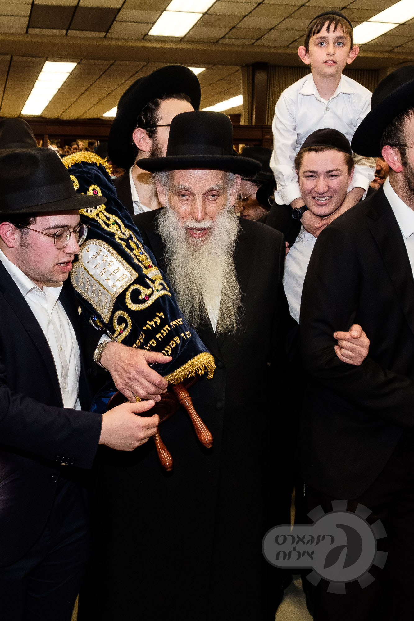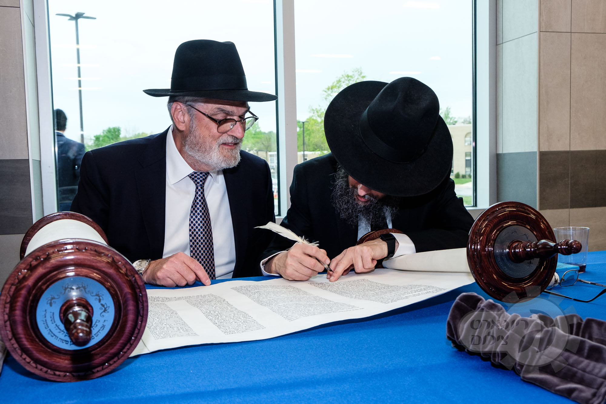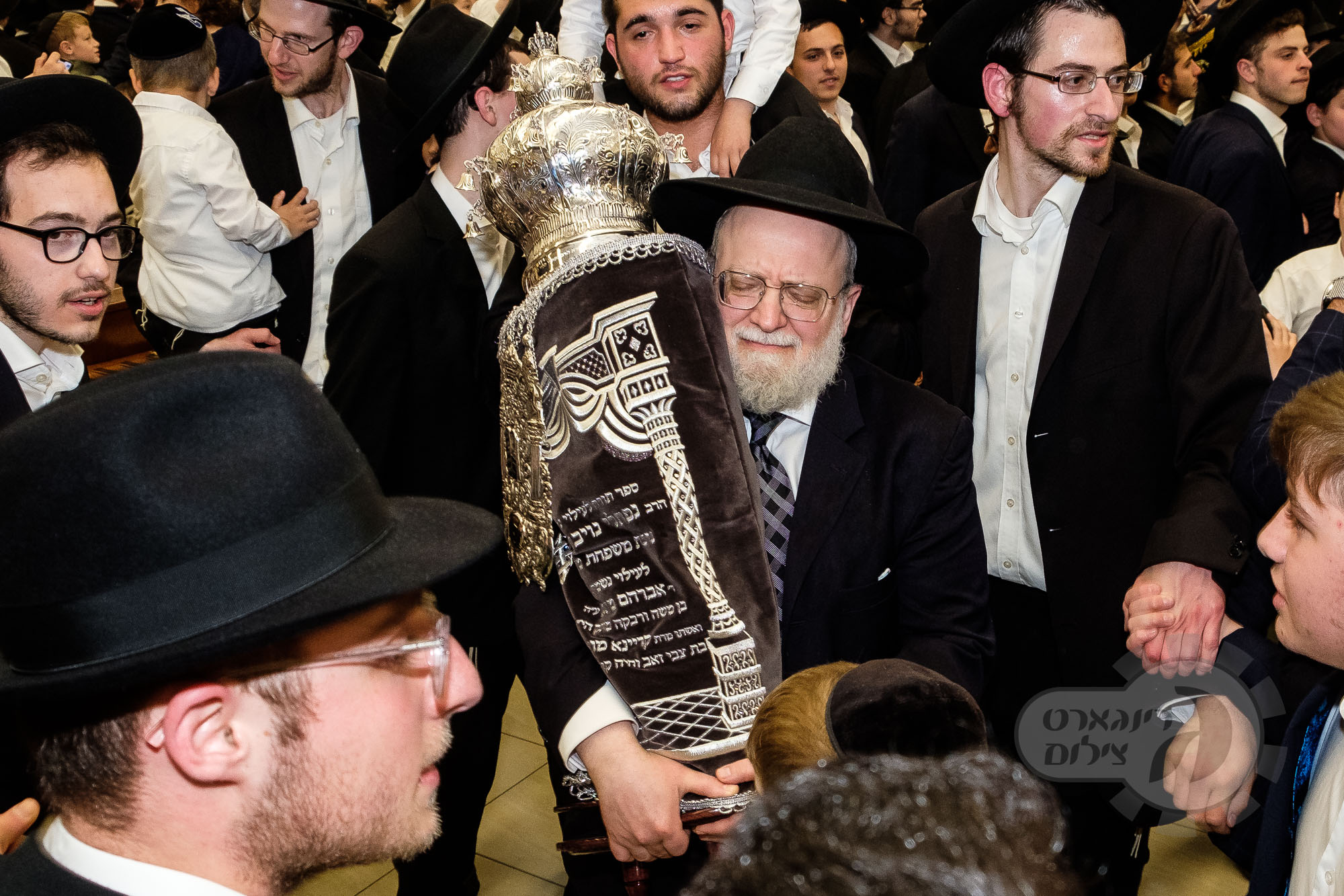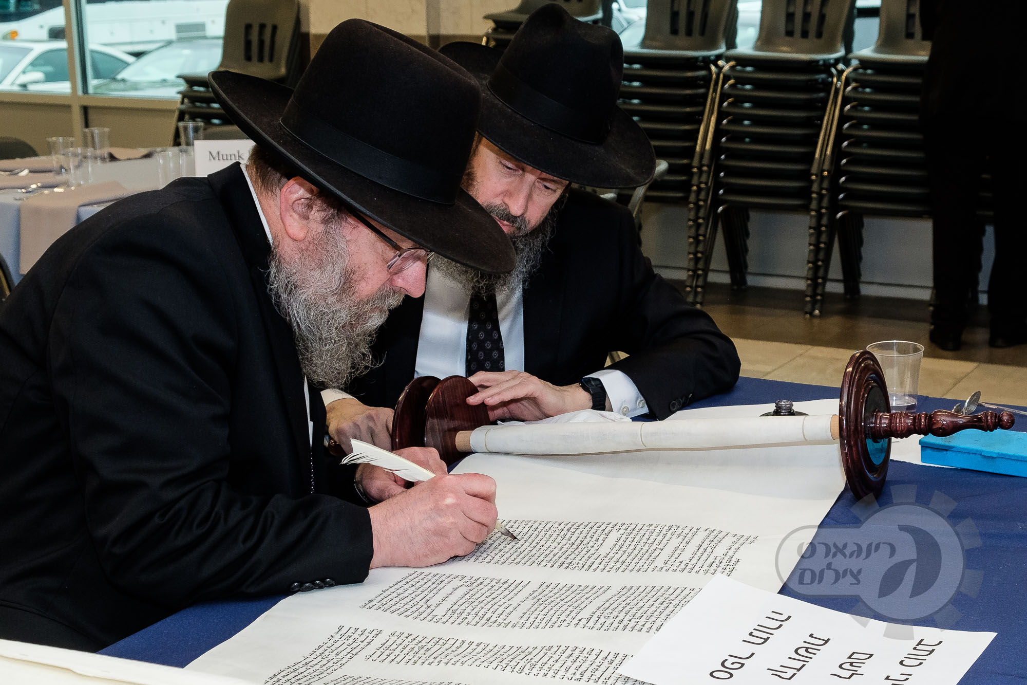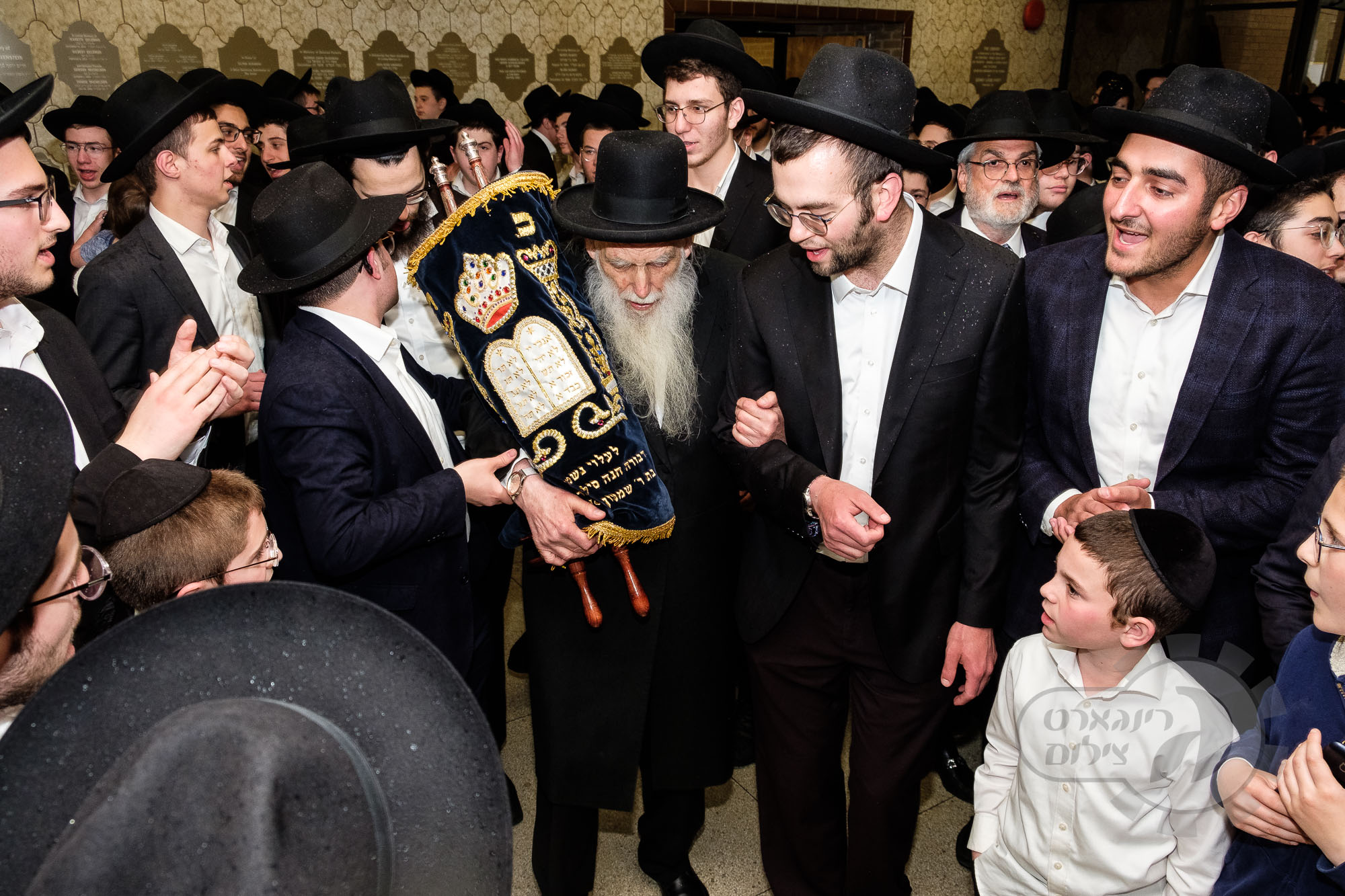 On Sunday, May 1st the Yeshiva held an Hachnosas Sefer Torah on campus. The new sefer was written by Rabbi Shlomo Naiman in memory and in honor of Rabbi Herman Naftoli Neuberger zt”l, the long time President of Ner Yisroel. The sefer was dedicated by the family of Dr. and Mrs. Zev Munk of Houston, TX in memory of Dr. Munk’s parents. Festivities began with the writing of the final letters of the Sefer Torah by the Yeshiva Rebbeim and Hanhala and members of the Munk family. Divrei bracha were given by the Rabbi Boruch Neuberger, Dr. Munk as well as by the Rosh HaYeshiva, Moreinu Harav Aharon Feldman shlit”a. Hundreds of yeshiva talmidim led the procession from the dining room to the Yeshiva Beis Medrash. Amidst live music and lively singing and dancing the Sefer was brought to its new home inside the Ner Yisroel Aron Kodesh. Families and children from those who live on the Yeshiva campus as well as from the greater Baltimore community came to watch and participate in this event of Kavod HaTorah.